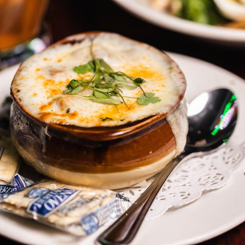 NY strip, bacon, Guinness BBQ onions, cheddar-porter cheese, garlic crostini, served open-faced.
