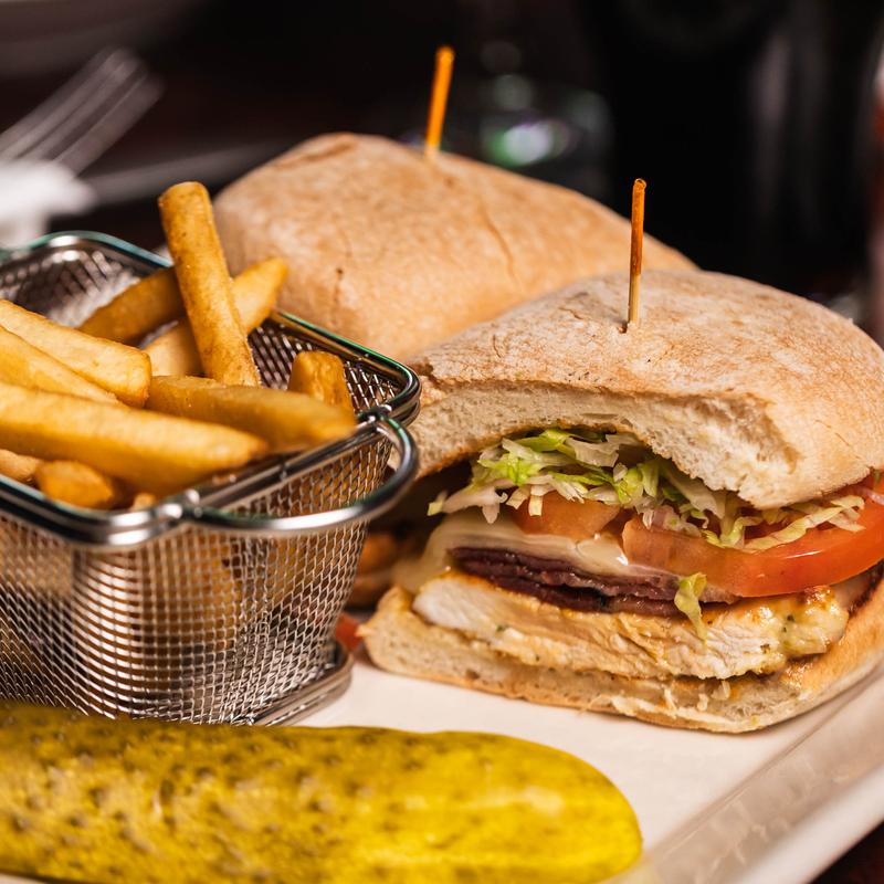 Grilled chicken breast, white cheddar, applewood smoked bacon, mango chutney mayo, ciabatta bread.